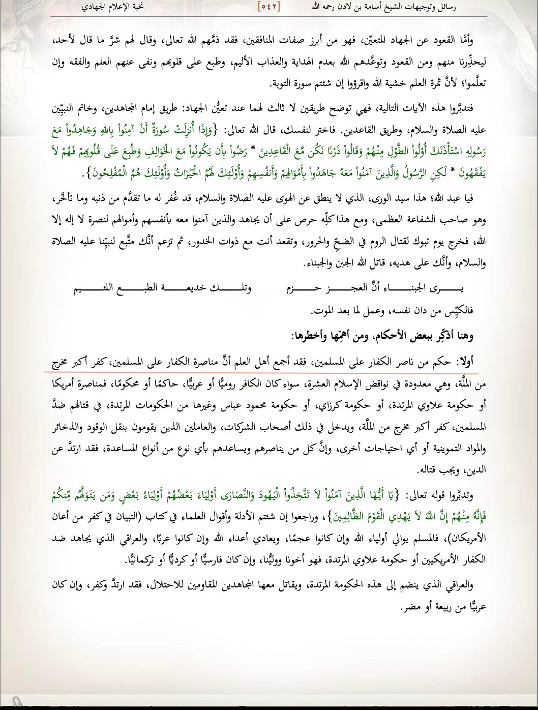 من الملَّة، وهي معدودة في نواقض الإسلام العشرة، سواء كان الكافر روميًّا أو عربيًّا، حاكما أو محكوما، فمناصرة أمريكا أو حكومة علاوي المرتدة، أو حكومة كرزاي، أو حكومة محمود عباس وغيرها من الحكومات المرتدة، في قتالهم ض َّد المسلمين، كفر أكبر مخرج من الملَّة، ويدخل في ذلك أصحاب الشركات، والعاملين الذين يقومون بنقل الوقود والذخائر والمواد التموينية أو أي احتياجات أخرى، وإ َّن كل من يناصرهم ويساعدهم بأي نوع من أنواع المساعدة، فقد ارت َّد عن