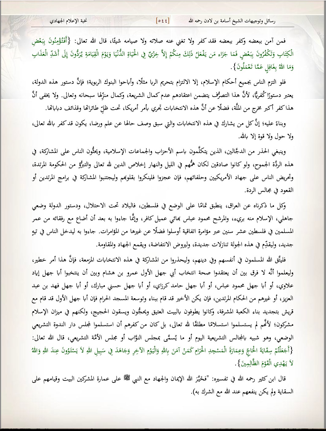 এরপর তিনি সেসব ইসলামী দলকে দাজ্জাল আখ্যা দিয়েছেন যারা রাজনৈতিক দল ও ইসলামী জামায়াতের পরিচয়ে মানুষকে এজাতীয় মুরতাদ হওয়ার নির্বাচনের দিকে আহ্বান করে। তারা যদি সত্যবাদী হতো তাহলে রাত-দিন তাদের চিন্তা থাকতো এসমস্ত মুরতাদ শাসক থেকে মুক্ত হওয়ার এবং মানুষকে আমে-রিকা ও তাদের সহযোগীদের সাথে জি-হাদ করার। তারা যদি এটা না পারে, তাহলে তারা অন্তর দিয়ে এগুলো অস্বীকার করবে এবং এধরণের মুরতাদদের প্রোগ্রামে অংশগ্রহণ থেকে বিরত থাকবে এবং মুরতাদ হওয়ার এসেম্বলীতে বসা থেকে বেচে থাকবে।